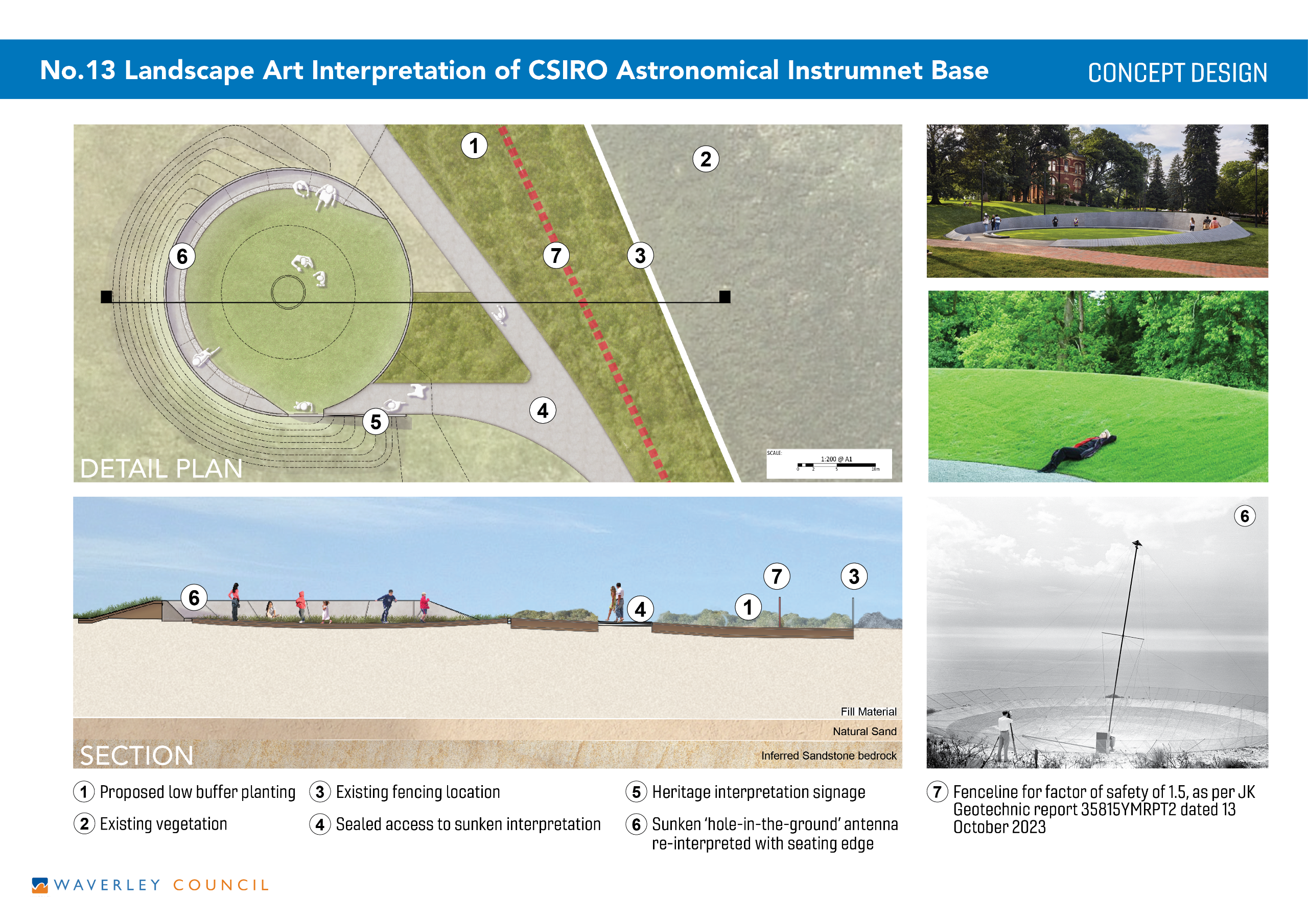 Concept designs of two options, along with photos of precedents and the historical elements, for the CSIRO historical site interpretation are shown below.